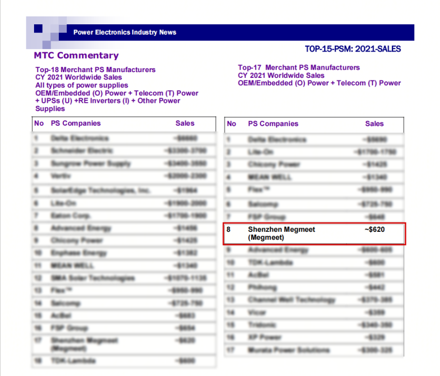 2022年3月31日,根據(jù)全球知名電源市場(chǎng)調(diào)查機(jī)構(gòu)MTC(Micro-Tech Consultants)最新出爐的電源市場(chǎng)報(bào)告顯示,麥米電氣位居全球電源供應(yīng)商銷量第8名,較于2019年前進(jìn)3名。